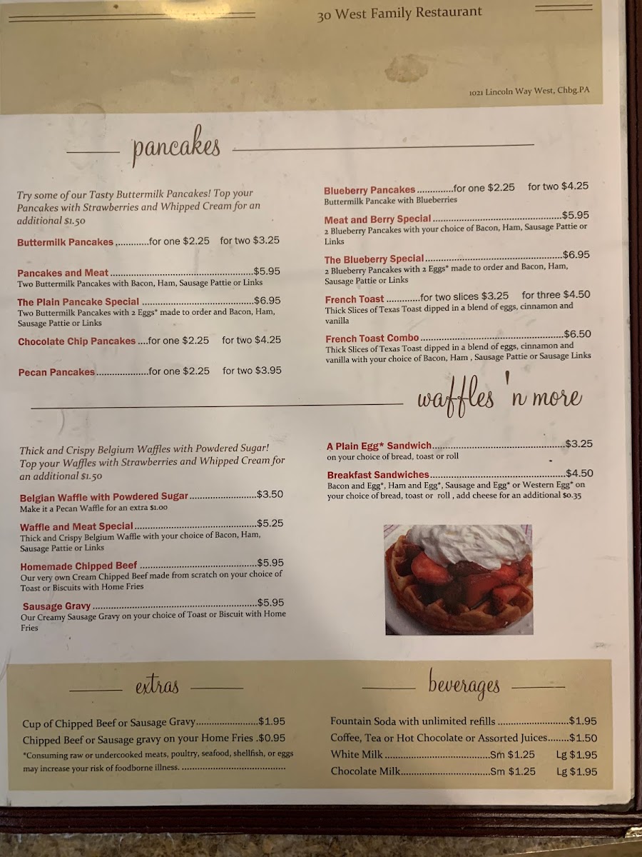 Nestled at 1021 Lincoln Way W in Chambersburg, PA, West Family Restaurant offers a delightful array of homemade breakfast and lunch options that cater to every palate. Start your day with fluffy omelettes, served with crispy home fries and toast, featuring a variety of cheeses and toppings like ham, bacon, or fresh vegetables for just $6.95. For pancake lovers, options abound from classic buttermilk to indulgent blueberry variations, with prices starting at just $2.25.